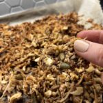 Bake for 20 minutes, turn the pans and bake for another 5-10 minutes. Keep a close eye as you don't want it to burn. The granola will turn a golden brown which is what you want!